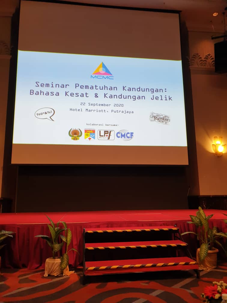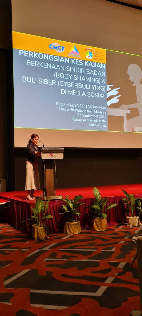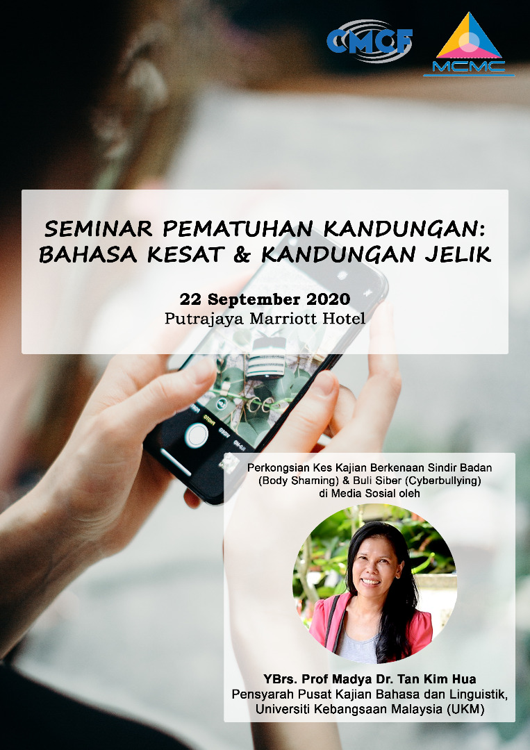 Seminar Pematuhan Kandungan: Bahasa Kesat & Kandungan Jelik dianjurkan oleh Suruhanjaya Komunikasi dan Multimedia Malaysia (MCMC) pada 22 September 2020 di Putrajaya Marriott Hotel. Topik yang menjadi diskusi dalam seminar ini ialah Perkongsian Kajian Berkenaan Sindir Badan (Body Shaming) & Buli Siber (Cyberbullying) di Media Sosial oleh Prof Madya Dr. Tan Kim Hua.